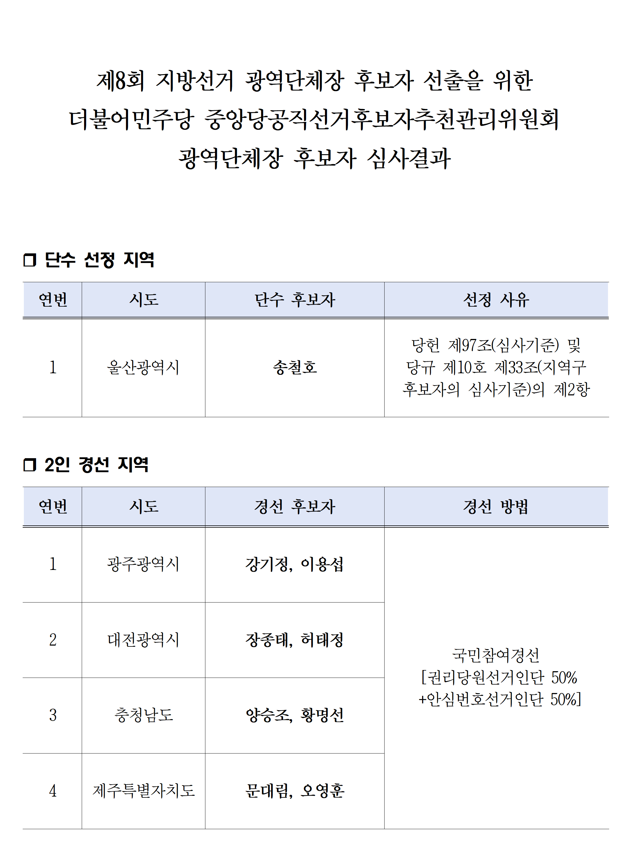 제8회 지방선거 광역단체장 후보자 선출을 위한 더불어민주당 중앙당공직선거후보자추천관리위원회 광역단체장 후보자 심사결과