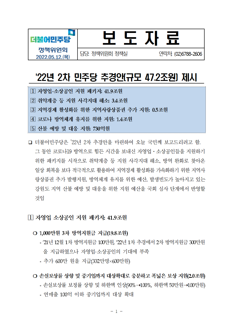 220512_(보도자료)_22년_2차_민주당_추경안(규모_47_2조원)_제시.hwp