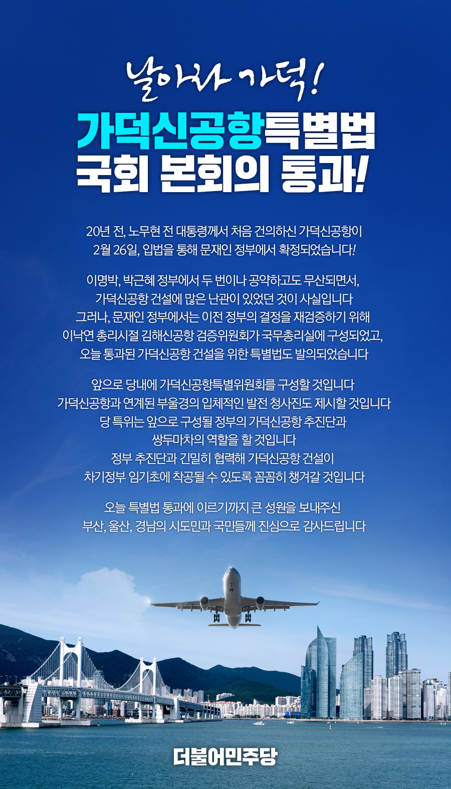 날아라 가덕! 가덕신공항특별법 국회 본회의 통과!