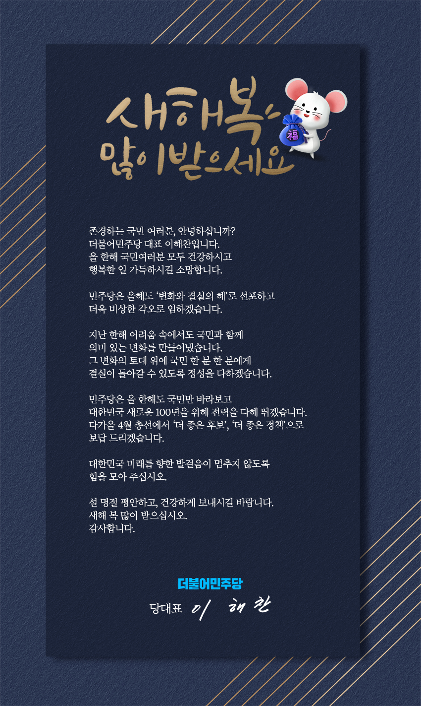 존경하는 더불어민주당 권리당원 동지 여러분! 대표 이해찬입니다.