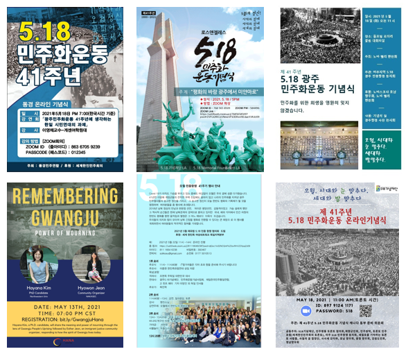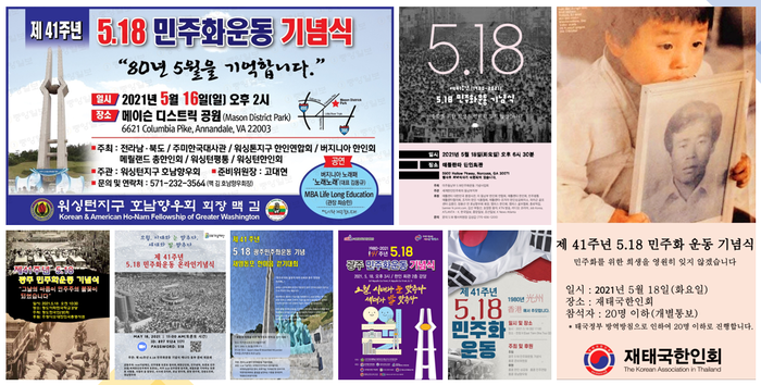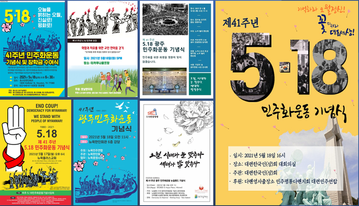 2021년에 맞는 제 41주년 광주 민주화운동 기념식이 온라인과 오프라인에서 준비되고 있다. 세계한인민주회의 공식 단톡방에는 세계 각국에서 준비되는 광주 민주화운동 기념식 포스터가 공유되고 있고, 코로나 19로 인해 모임 인원이 제한된 국가에서는 온라인 기념식, 일상 생활이 가능한 나라에서는 오프라인 기념식이 준비되거나 진행되었다.