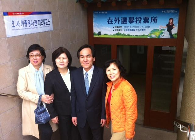 ▲ 19대 총선 해외투표는 3월 28일 부터 4월 2일까지 5일간 재외공관 투표소에서 일제히 시작, 사진은 일본 오사카 총영사관에 마련된 투표소에서 투표를 마친 오사카 민주연합 임원들. ©민주회의