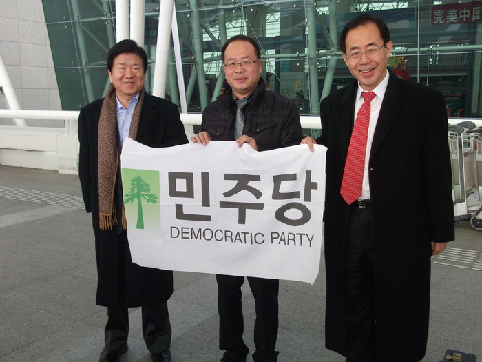 ▲ 세계한인민주회의 창립 중앙추진위 발대식 직후 미국 등 주요국가를 숨가쁘게 방문한 김성곤 의원이 워싱턴 DC지역 공항에서 민주당 당기를 펼쳐들고 있다. ©민주회의