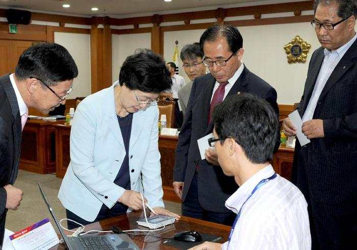▲ 한명숙명예의장이 중앙선관위를 방문해 재외투표소에서의 투표절차 과장을 점검하고 있다. ©민주회의