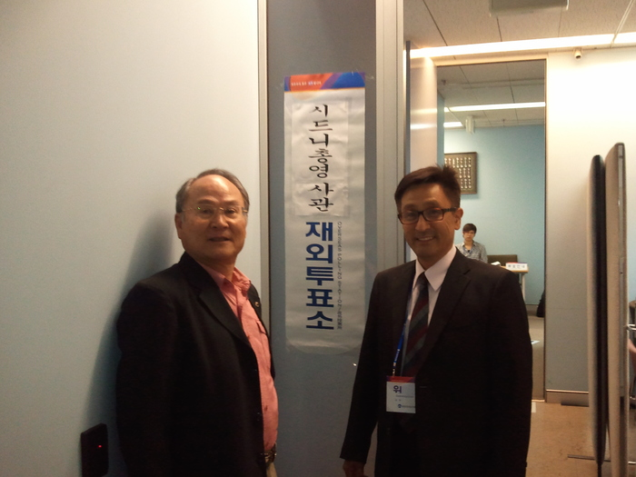 ▲ 호부 시드니 투표소 앞에서 인증사진을 찍은 이수길 호주민주연합 대표와 민주당 추천 선관위원 ©민주회의
