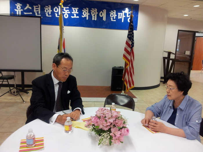 ▲ 한명숙 명예의장이 휴스톤 총영사를 만나 달라스 지역 추가 투표소 설치 필요성을 설명하고 있다. ©민주회의