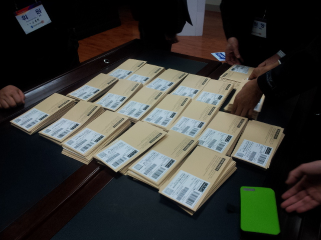 ▲ 5일동안 진행된 재외국민 투표를 마감하고 투표용지를 서울로 보내기 위한 작업이 진행되고 있다. ©민주회의