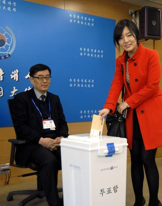 ▲ 중국 북경 투표소에 정태진 민주당 추천 선관위원 ©민주회의